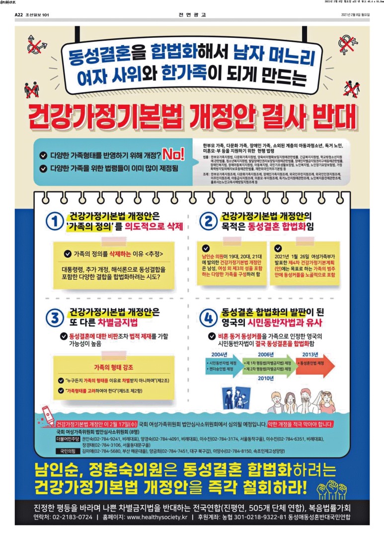 정춘숙,남인순의원 '건강가정기본법 개정안 결사반대' 전면광고 -21. 2. 8(조선,국민)