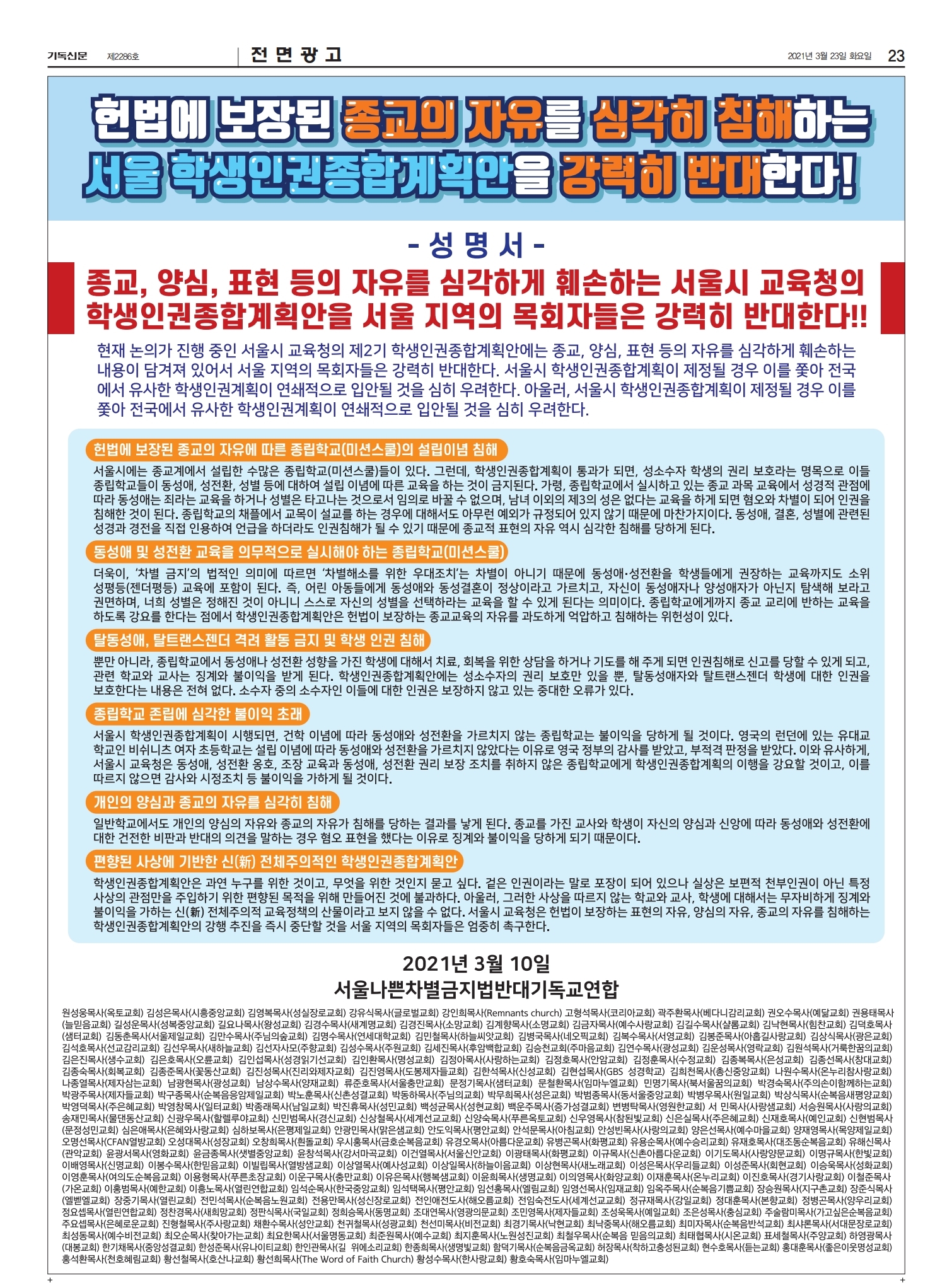 서울나쁜차별금지법반대기독교연합 성명서-학생인권종합계획 반대(3.23)